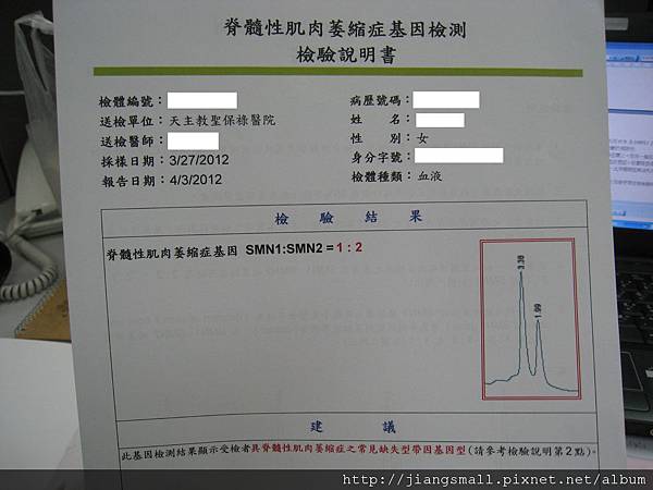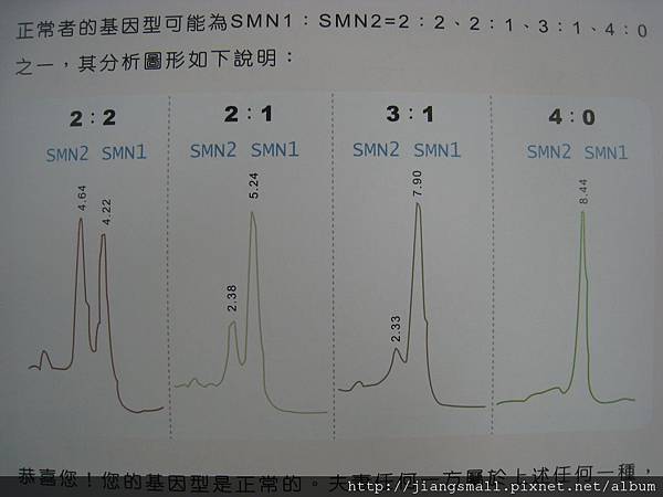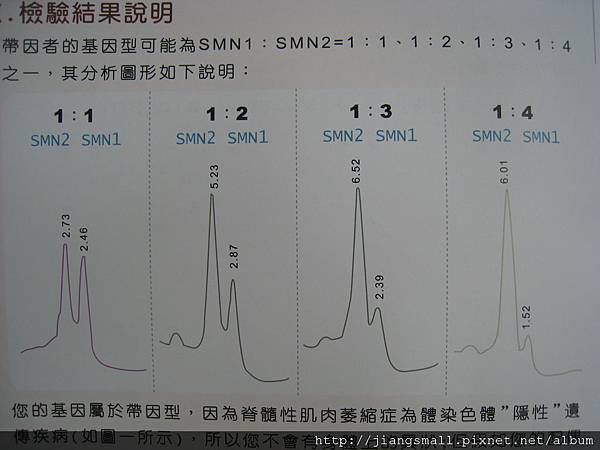 - 1. 少數SMA帶因者其2套SMN1基因皆位於同一條染色體上,而另一條則無SMN1基因,此種狀況會導致檢測結果呈現偽陰性(檢驗結果為非帶因,但實際為帶因)