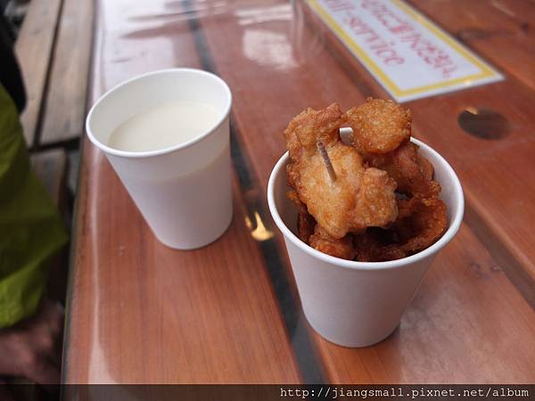 豆漿是沒加甜的,炸雞OK。。。旁邊就是yojiya咖啡。如果是用外帶杯,就沒有那個頭像的拉花喔。。。